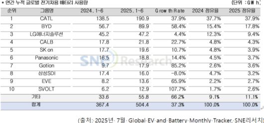 LG에너지솔루션은 전년 동기 대비 4.4%(47.2GWh) 성장하며 3위를 유지했고 SK온은 10.7%(19.6GWh)의 성장률을 기록해 5위에 올랐다.