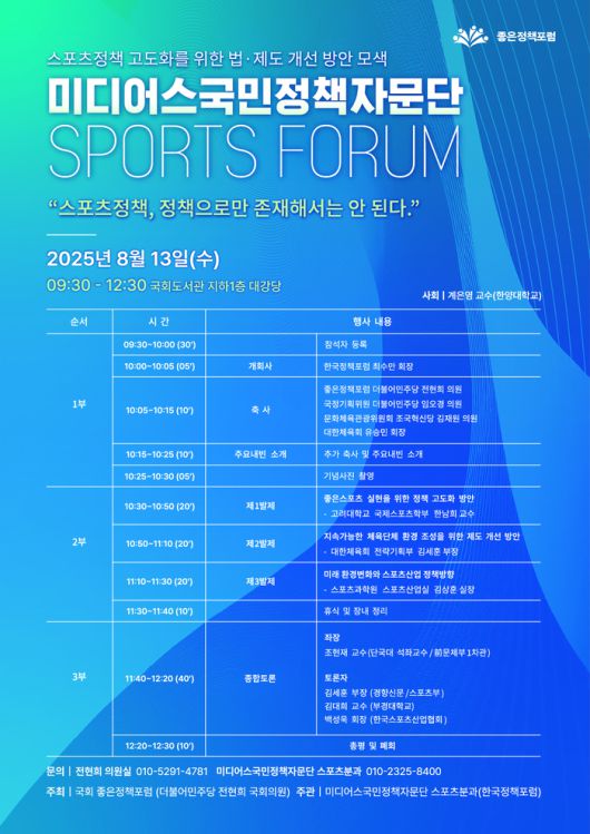 이번 포럼은 더불어민주당 전현희 최고위원이 좌장을 맡은 ‘국회 좋은정책포럼’이 주최하고, ‘미디어스 국민정책자문단’ 스포츠분과가 주관한다.