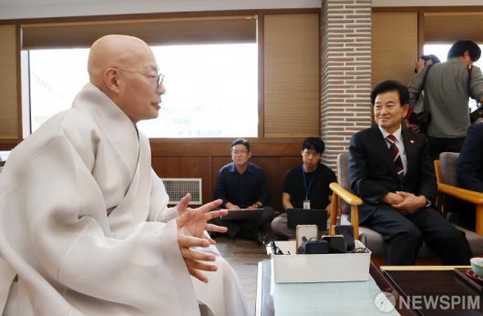 [서울=뉴스핌] 정일구 기자 = 정동영 통일부 장관이 4일 오전 서울 종로구 조계사를 찾아 조계종 총무원장인 진우스님을 예방하고 있다. 2025.08.04 mironj19@newspim.com
