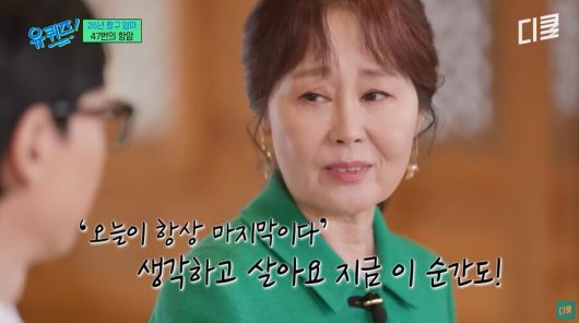 지난해에는 tvN '유퀴즈 온 더 블럭'에 출연해 현재는 추적 관찰 중이라며 대장암 투병에 대해 언급한 바 있다. 그는 "4년이 됐다. 건강검진에서 발견돼 간으로 전이됐다. 47번 항암을 받았다"고 담담히 밝히면서 "그 이후부터는 항상 '오늘이 마지막이다'라는 마음으로 산다"고 말했다.
