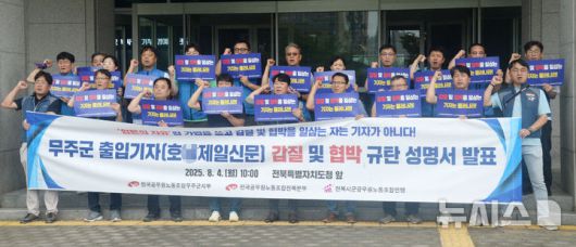 [전주=뉴시스] 김얼 기자 = 전국공무원노동조합무주군지부 관계자들이 4일 전북 전주시 전북특별자치도청 앞에서 무주군 출입기자 갑질 및 협박 규탄 성명서 발표 기자회견을 열고 구호를 외치고 있다. 2025.08.04. pmkeul@newsis.com |