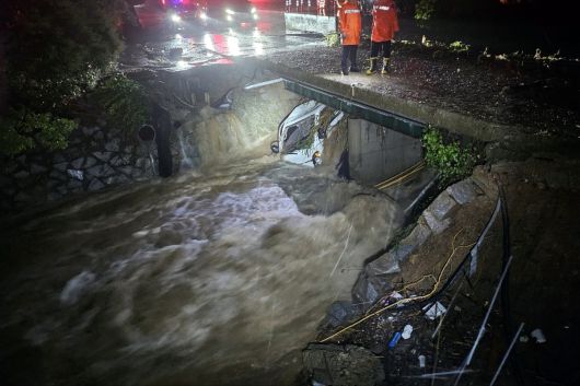 전남 무안에 시간당 최고 142.1㎜의 폭우가 쏟아진 지난 3일 오후 전남 무안군 청계면에서 물살에 떠내려온 1t 트럭이 하천에 빠져있다. 연합뉴스 |