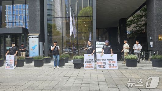 (서울=뉴스1) 윤수희 기자 = 쿠팡 직고용 인원들로 구성된 '쿠팡 친구'(쿠친) 노동조합원들이 '택배없는 날' 시행을 반대하고 나섰다.