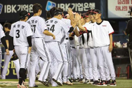 승리 후 염경엽 감독(오른쪽)을 비롯한 코칭스태프와 하이파이브를 나누는 LG 선수단. [사진=LG] |