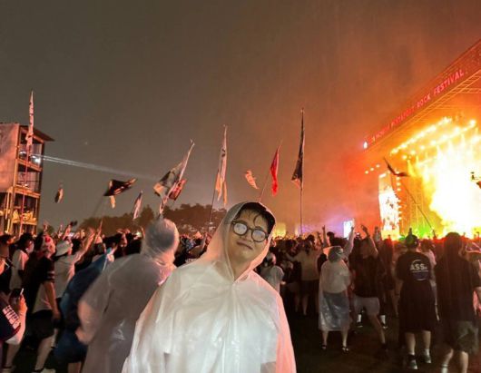 사진 속 한 전 대표는 우비를 입은 채 관객들 사이에 서서 미소를 짓고 있다. 그의 안경은 습기로 인해 김이 서린 모습이다. 한 전 대표는 잔디밭에 앉아 다리를 뻗고 공연을 관람하기도 했다.