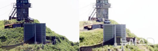 [파주=뉴시스] 홍효식 기자 = 우리 군이 전방지역에 설치된 대북확성기 철거를 시작한 4일 경기도 파주시 접경지역에서 바라본 한국 측 초소 앞 군사 시설물 내 대북확성기가 철거된 모습(왼쪽). 오른쪽 사진은 대북 확성기가 설치된 지난 6월 12일 모습. 2025.08.04. yesphoto@newsis.com |