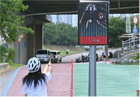 특히 주목할 점은 평소에는 자전거전용도로 안전수칙 및 전방주의 안내문이 표시되던 전광판이, AI영상감지센서에 시속 10km 이상으로 주행하는 자전거가 감지될 경우 해당 영상을 실시간으로 송출해 다른 이용자들이 이를 즉시 확인할 수 있도록 하는 스마트 경고 시스템이 전국 최초로 적용됐다는 것이다.