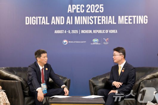 (서울=뉴스1) = 류제명 과학기술정보통신부 제2차관이 4일 인천광역시 연수구 송도컨벤시아에서 슝지쥔 중국 공업정보화부 부부장을 만나 디지털 AI 분야 협력 확대 방안을 논의하고 있다. (과학기술정보통신부 제공. 재판매 및 DB 금지) 2025.8.4/뉴스1photo@news1.krCopyright ⓒ 뉴스1. All rights reserved. 무단 전재 및 재배포, AI학습 이용 금지.