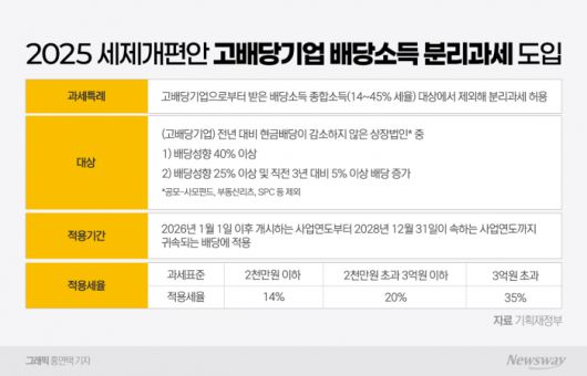 4일 기획재정부는 내년부터 고배당기업 배당소득을 금융소득종합과세 대상에서 제외해 분리과세하는 내용의 '2025년 세제개편안'을 공개했다. 개편안에는 배당·이자 등 금융 소득이 2000만원 이하인 투자자는 기존대로 14% 저율 과세하고 2000만원 초과 3억원 이하 투자자는 20%, 3억원 초과 투자자는 35%의 세율을 적용하는 내용이 담겨 있다. 그간 배당소득은 2000만원을 초과할 시 종합과세 대상으로 적용돼 규모에 따라 최대 49.5% 세율이 적용됐다.