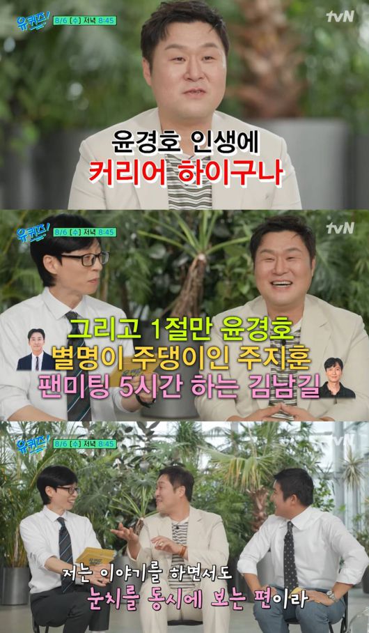 이어 유재석은 "윤경호 씨가 배우 톱3다. 말 많은 배우 톱3다. 팬미팅 5시간 하는 김남길, 별명이 주댕이인 주지훈, 그리고 1절만 윤경호다"라고 했다. 이를 들은 윤경호는 "저는 이야기를 하면서도 눈치를 동시에 살피는 스타일이다. 말을 하면서 줄여야 할 것 같으면 자동적으로 줄인다"라고 밝혔다.