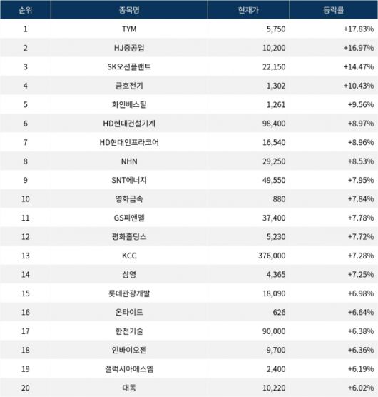 이어 상승률 2위 HJ중공업(097230)은 주가가 16.97% 급등하며 종가 10,200원에 상승 마감했다. 상승률 3위 SK오션플랜트(100090)의 주가는 22,150원으로 14.47% 급등하며 부진했다. 상승률 4위 금호전기(001210)는 10.43% 급등하며 1,302원에 마감했다. 상승률 5위 화인베스틸(133820)은 9.56%의 상승세를 타고 종가 1,261원에 마감했다.
