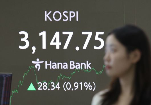 4일 서울 중구 하나은행 딜링룸 현황판에 코스피 종가가 표시돼있다. 이날 코스피 지수는 전장보다 28.34포인트(0.91%) 오른 3147.75, 코스닥 지수는 11.27포인트(1.46%) 오른 784.06에 장을 마쳤다./연합뉴스