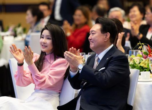 윤석열 전 대통령 부부가 지난해 7월 8일 미국 하와이 동포 만찬 간담회에 참석해 박수치고 있다. 한국일보 자료사진 |