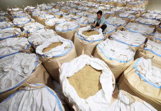 경기도 화성시 수라청농협쌀조합공동사업법인 저온창고에서 관계자가 보관 중인 쌀을 살펴보고 있다.(사진=연합뉴스) |