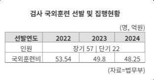 국회 예산정책처의 '2024년 회계연도 결산 위원회별 분석' 보고서에 따르면, 지난해 검사의 국외훈련 지원 예산은 총 48억7600만원이 투입됐다. 같은 기간 장기훈련 57명, 단기훈련 22명 등 79명이 국외훈련을 떠났다는 점을 감안해 단순 계산하면 검사 1명당 평균 6100만원의 국비를 쓴 셈이다.