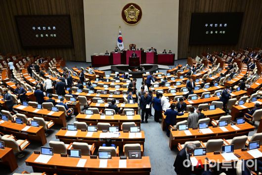 아시아투데이 이병화 기자 = 더불어민주당 의원들이 4일 국회에서 열린 본회의에서 '방송3법(방송법·방송문화진흥회법·한국교육방송공사법 개정안)' 상정과 관련해 신동욱 국민의힘 의원이 무제한토론(필리버스터)을 시작하자 본회의장을 나서고 있다. ⓒ "젊은 파워, 모바일 넘버원 아시아투데이"