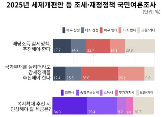 “복지 확대를 위해 증세를 추진할 경우 인상해야 할 세금”을 묻는 질문에는 법인세가 34.0%로 가장 많이 꼽혔다. 2위는 종합부동산세로 29.4%였다. 두 세목을 합쳐 63.4%로 과반을 기록했다. 이어 모름·기타(20.7%), 소득세(9.2%), 부가가치세(6.8%) 순이었다.