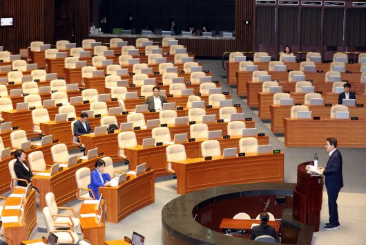 신동욱 국민의힘 의원이 4일 오후 서울 여의도 국회에서 열린 제427회국회(임시회) 제3차 본회의에서 방송3법 반대 필리버스터(무제한토론)를 하고 있는 가운데 더불어민주당 의원들의 빈자리가 눈에 띄고 있다.
