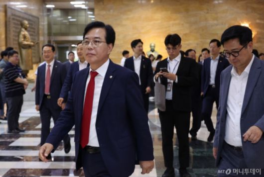 [서울=뉴시스] 김금보 기자 = 송언석 국민의힘 비상대책위원장 겸 원내대표와 의원들이 4일 오후 서울 여의도 국회에서 본회의장으로 향하고 있다. 2025.08.04. kgb@newsis.com /사진=김금보 |