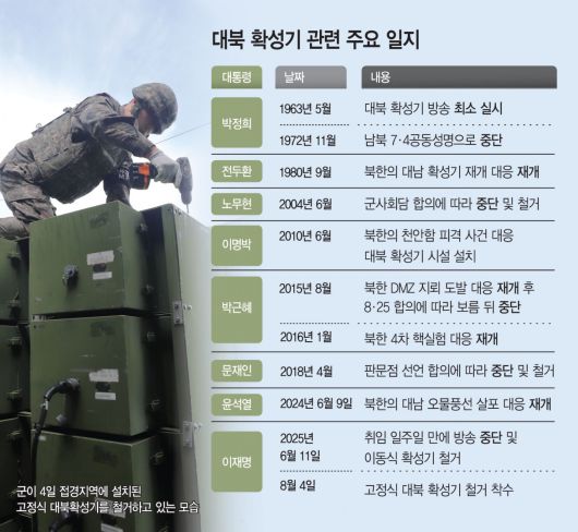 우리 군이 대북확성기 철거를 4일 시작했다. 북한의 오물풍선 살포에 대응해 재개했던 대북확성기 방송은 이재명 정부가 들어서면서 곧바로 중지됐고, 이후 두 달 만에 본격 철거된다. 남북 간 강대강 대치의 핵심적인 산물이었던 '대북확성기'를 우리 정부가 먼저 철거하면서 북한에 대화 채널 재개설을 위한 실질적인 메시지를 보낸 것이란 관측이 나온다.