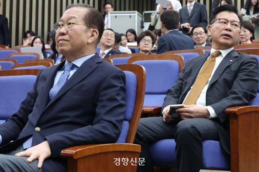 권영세 전 국민의힘 비대위원장(왼쪽)과 이양수 전 사무총장이 지난 5월8일 국회에서 열린 의원총회에 참석해 자리에 앉아 있다. 한수빈 기자 |