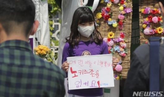 한 어린이가 2022년 5월 서울 영등포 국회 앞에서 열린 ‘어린이날 100주년, 어린이차별철폐의 날 선포 기자회견’에 참석해 노키즈존 반대 문구가 적힌 스케치북을 들고 있다. 뉴시스 |