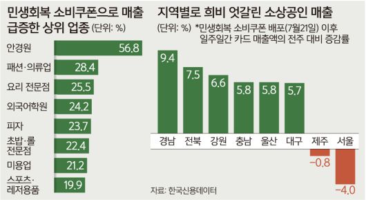 인구소멸 지역 등 지역에 따른 발급액 차이로 인해 지역별 매출도 큰 차이를 보였다. 경남(9.4%), 전북(7.5%), 강원(6.6%), 충남(5.8%), 울산(5.8%), 대구(5.7%) 등이 전주 대비 매출증가 폭이 컸고, 서울(-4.0%)과 제주(-0.8%)는 오히려 매출이 줄었다. 매출이 큰 폭으로 증가한 경남의 경우 11개 시·군이 인구감소 지역으로 주민들이 5만원의 소비쿠폰을 추가로 지급받았다.