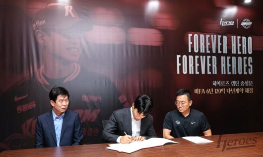 비FA 다년계약 체결식은 지난 3일 고척 롯데 자이언츠전이 끝난 뒤 서울 신도림에 위치한 호텔에서 송성문의 아내와 부모님이 참석한 가운데 진행됐다. 이번 계약으로 송성문은 2026년부터 2031년까지 히어로즈 유니폼을 입고 활약할 예정이다.