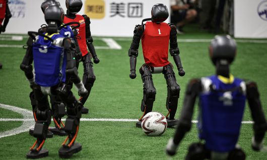 4일(현지시간) ‘이좡 로봇 소비 축제’가 열린 베이징 이좡 경제기술개발구에서 로봇축구 시범 경기가 진행되고 있다. 베이징=EPA연합뉴스