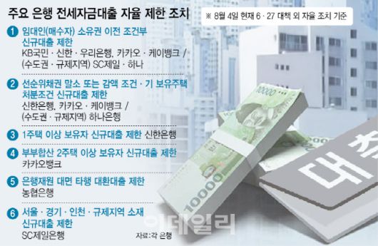 아울러 지난 1일부터 ‘KB직장인 든든 신용대출’ 시리즈 3종을 모두 판매 중단했다. SC제일은행은 지난 7월 21일부터 5년 주기형 주택담보대출 상품만 대면으로 취급하고 있다. 다른 은행도 가계대출 증가 폭을 모니터링하며 추가 대출제한 조치를 검토하고 있다.