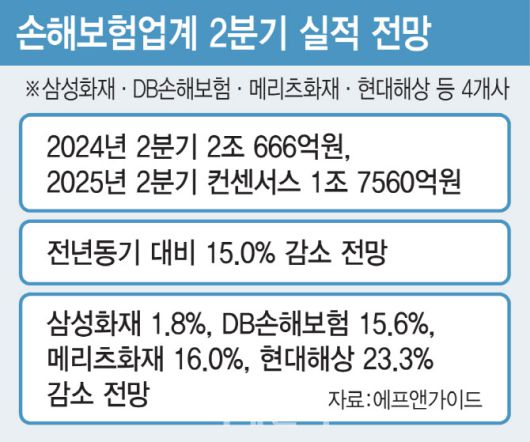 4일 금융정보업체 에프앤가이드 등에 따르면 삼성화재와 DB손해보험, 메리츠화재, 현대해상 등 주요 4개 손해보험사의 올 2분기 당기순이익 컨센서스는 1조 7560억원 수준으로 지난해보다(2조 666억원) 15% 감소할 전망이다. 손보업계 1위인 삼성화재는 이달 13일 2분기 실적을 발표할 예정이다. 삼성화재는 보험 손익이 감소했지만 부동산 매각 등 투자수익 증가 여파로 당기순이익 6011억원, 지난해 같은 기간보다(6124억원) 1.8% 줄어드는데 그칠 것으로 예측됐다. 하지만 DB손해보험 당기순이익은 4563억원으로 15.6%(지난해 5407억원), 메리츠화재는 4259억원으로 16.0%(5068억원), 현대해상 2727억원으로 23.3%(3557억원) 등 각각 15~23%가량 순이익이 대폭 감소할 것으로 예상했다.