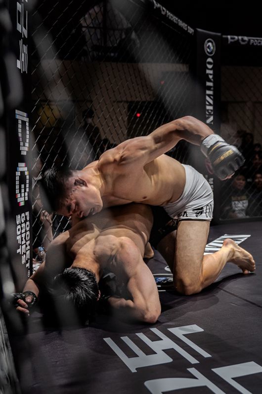 | 대한민국 UFC 7호 파이터 남의철이 2025년 8월 경기도 오산시 블랙컴뱃 라이즈 7 메인이벤트 페더급 한일전에서 ‘아이언 힙’ 미야히라 슈타로를 ‘코리안 불도저’ 특유의 그라운드 앤드 파운드로 공격하고 있다. 사진=이데아 파라곤 제공 |