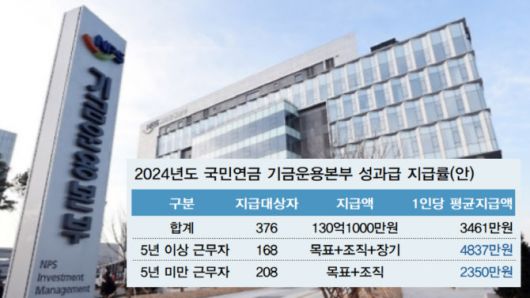 국민연금 기금운용본부 작년 한 해 성과에 대한 1인당 평균지급액은 △5년 미만 근무자(총 208명) 2350만원 △5년 이상 근무자(총 168명) 4837만원이다.