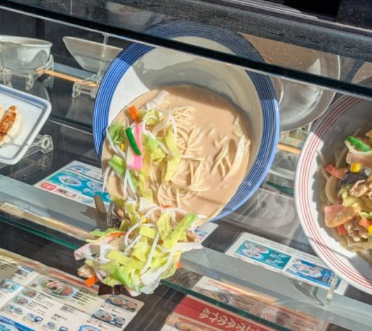폭염에 라멘 모형이 녹아 앞으로 쏟아진 모습. /X