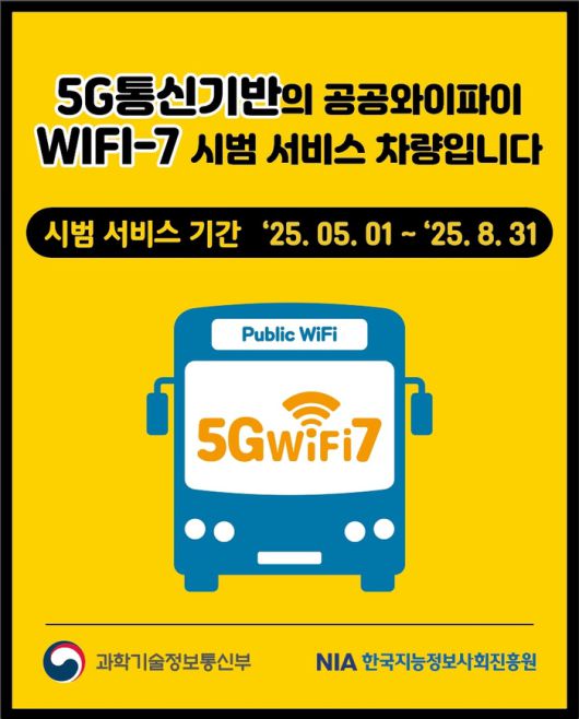 이번 시범 서비스는 과학기술정보통신부 산하 한국지능정보사회진흥원(NIA)이 주관하는 버스공공와이파이 사업의 일환으로 추진됐다. 5G·LTE 백홀 기반 와이파이 7 장비(AP, 무선 인증 및 데이터 전송을 통해 와이파이 지원 장치와 네트워크를 연결해주는 장비)를 기존 버스공공와이파이 임차운영 2차 및 3차 사업에 적용해 품질을 고도화하는 게 핵심이다.