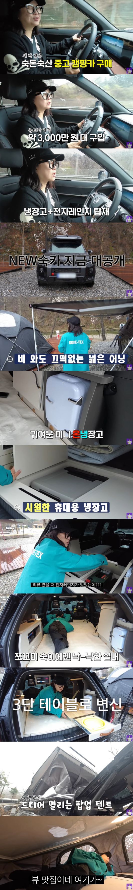 팝업 텐트가 장착된 전륜구동 기반의 중형 SUV라고. 김숙은 "3000만 원대에 구입했다"며 "냉장고, 전자레인지도 다 있다. 또 너무 귀여운 온장고가 있다. 걔보고 깜짝 놀랐다"며 리뷰를 앞두고 환한 미소를 지었다.