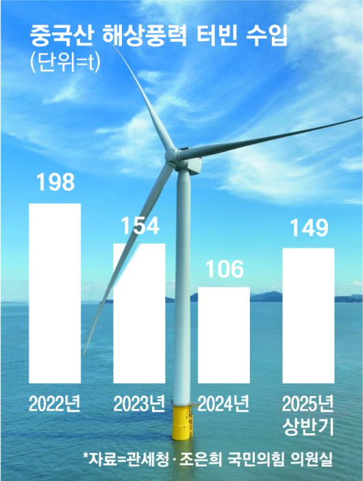 4일 조은희 국민의힘 의원실이 정부에서 받은 자료에 따르면 2021년부터 지난해까지 해상풍력에서 외국산 터빈 설비용량은 310.98메가와트(㎿)에 달했다. 이는 국내 제조 터빈 설비용량(315.63㎿)에 육박하는 규모다. 외국산 터빈은 주로 중국이나 유럽에서 제조된 것으로 파악됐다.