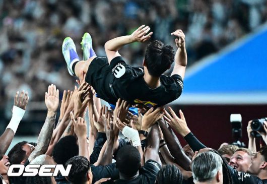[OSEN=지형준 기자] 손흥민(33, 토트넘)의 토트넘 홋스퍼 커리어가 막을 내렸다. 선발로 출전해 약 65분을 소화한 그는 뜨거운 반응을 이끌어내며 교체아웃됐다. 토트넘은 뉴캐슬 유나이티드를 상대로 무승부를 만들어냈다.토트넘 홋스퍼는3일 오후 8시 서울월드컵경기장에서 열린 쿠팡플레이 시리즈 20252경기 뉴캐슬 유나이티드와 프리시즌 친선경기를 치러 1-1 무승부를 거뒀다.토트넘 손흥민이 동료선수들에게 헹가래를 받고 있다. 2025.08.03 / jpnews@osen.co.kr