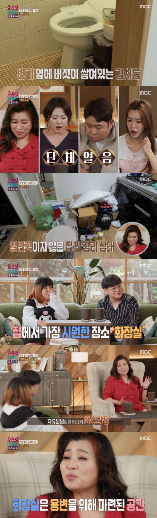 현관 앞에는 밥솥이, 쓰레기 옆에는 빨래 바구니가, 쓰레기와 음식물은 한자리에 모여 있었고, 부부는 화장실에 김치를 보관하는 이유로 "지금 냉장고가 꽉 차 있어서", "화장실이 시원해서"라고 답했다.