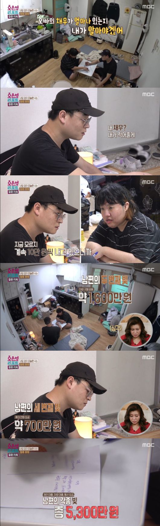 아내가 "오빠 채무가 얼마 있는지 내가 알아야겠다"고 하자 남편은 종이에 빚을 써내려갔고, 가장 먼저 개인 대출금 약 3천만 원을 언급했다.