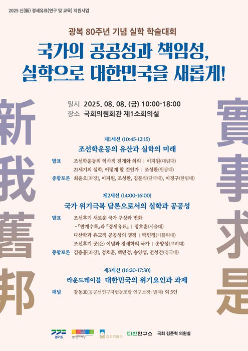 이 학술대회는 광복 80주년을 맞아 조선 후기 실학의 경세(經世) 정신을 바탕으로, 오늘날 국가적 과제와 사회적 갈등을 되짚기 위해 마련했다.