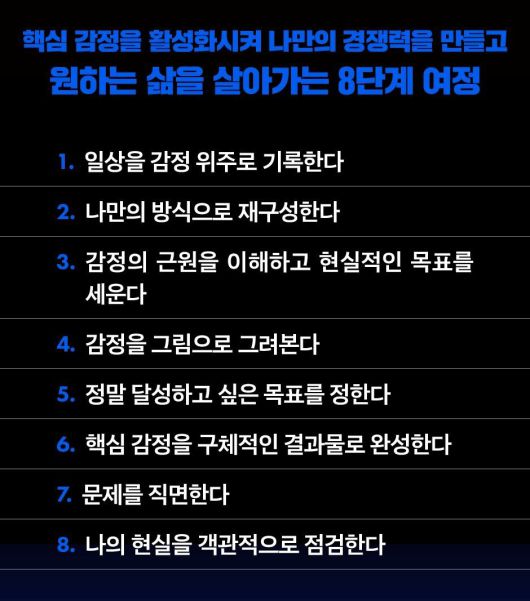 저자는 누구나 따라 할 수 있는 8단계 프로그램을 통해 자신만의 핵심 감정을 발견하고, 이를 토대로 창의성과 경쟁력을 키우는 법을 안내한다.