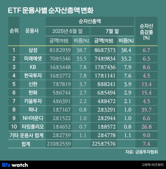 지난 7월 말 기준 국내 ETF 순자산총액 합계는 225조7576억원으로 지난 6월 말(210조2539억원) 대비 7.4%(15조5037억원) 늘었다.