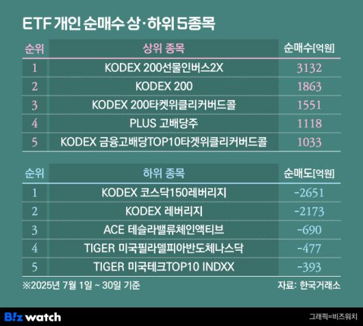 4일 ETF 체크에 따르면 지난 7월 개인 투자자가 가장 많이 순매수한 ETF는 삼성자산운용의 KODEX 200선물인버스2X였다. 코스피 상승에 따라 이 ETF 가격은 11.13% 하락했지만 개인은 3132억원어치를 순매수했다.
