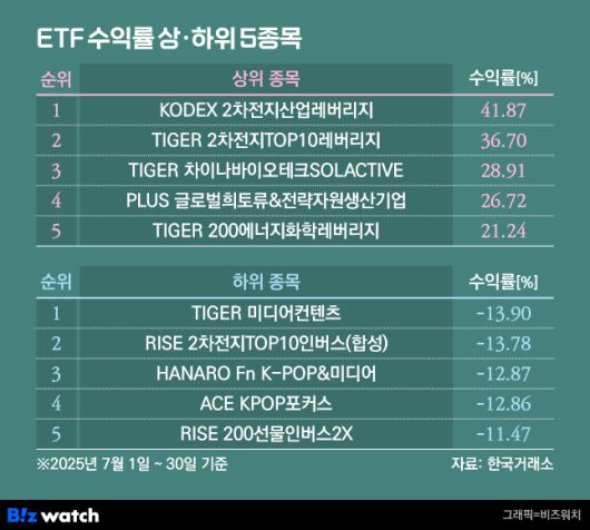 지난 7월 한 달간 ETF 수익률 1~2위를 기록한 상품은 이차전지 관련 기업 주가를 두배로 추종하는 ETF였다. 삼성운용의 KODEX 2차전지산업레버리지와 미래에셋운용 TIGER 2차전지TOP10레버리지는 각각 41.87%, 36.7% 수익률을 기록했다.