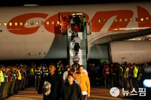 [카라카스 로이터=뉴스핌] 최원진 기자= 미국에서 추방된 베네수엘라 국적의 불법 이민자들이 24일(현지시간) 고국 수도 카라카스에 도착해 비행기에서 내리는 모습. 2025.03.24 wonjc6@newspim.com |