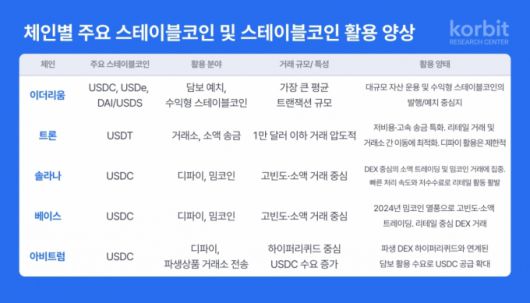 코빗 리서치센터는 스테이블코인의 활용은 체인 특성에 따라 뚜렷하게 달라진다고 분석했다. 이더리움은 높은 보안성과 자금 규모를 바탕으로 디파이 담보 자산 중심의 활용이 두드러지고 트론은 저수수료·고속 전송을 기반으로 송금 및 결제에 특화돼 있다. 각 체인 내 경제 구조와 맞물려 작동하는 기능별 인프라 자산으로 진화하고 있다는 설명이다.