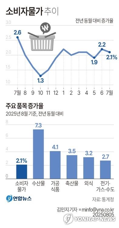 (세종=연합뉴스) 민경락 안채원 기자 = 7월 소비자물가가 가공식품·수산물 등 가격이 오르면서 두 달째 2%대 상승세를 이어갔다.