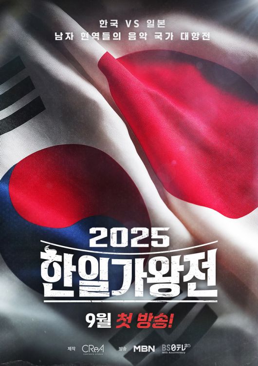 이와 관련 오는 9월 2일(화) 첫 방송 날짜를 확정 지은 '2025 한일가왕전'이 더욱 불꽃 튈 '음악 한일전' 서막을 알리는 강렬한 티저 포스터를 공개해 기대감을 끌어올린다. '2025 한일가왕전' 티저 포스터는 대한민국의 태극기와 일본의 일장기가 팽팽히 맞붙어 화면을 가득 채우고 있다. 이어 강렬한 서체로 새겨진 '2025 한일가왕전'과 불꽃 같은 붉은 글씨로 강조된 '9월 첫 방송'이라는 문구가 단번에 긴장감을 형성한다. '국가 간 자존심을 건 음악 대결'이라는 테마에 걸맞게, 단순한 경연을 넘어 문화적 자긍심과 음악적 정체성, 예술적 사명감이 충돌하는 대서사시 서막을 시각적으로 완벽하게 구현해 호기심을 극대화한다.