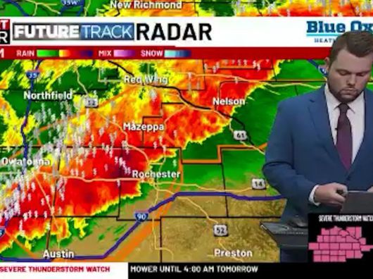 5일 USA투데이에 따르면 지난달 28일 로체스터 지역방송(KTTC)의 기상 캐스터 닉 얀센은 미네소타 남동부와 아이오와 북부 지역에 발생한 폭풍우 상황에 대한 소식을 전하던 중 갑자기 휴대폰을 꺼내 들었다.